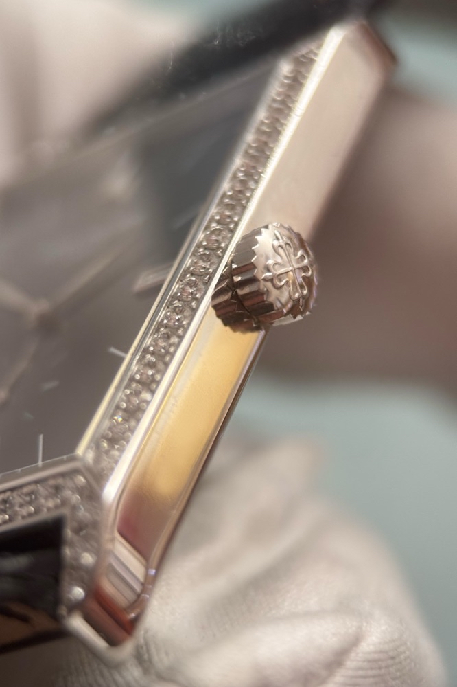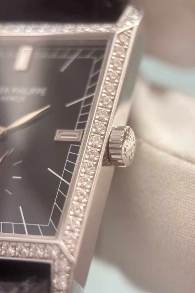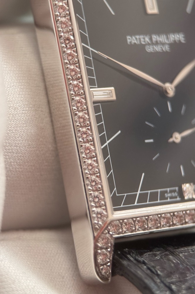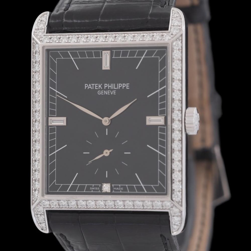 Schwarzes Glanzzifferblatt mit weißgoldenen Stabindizes, Baguette-Diamanten bei 3,9 und 12 Uhr, Brillant bei 6 Uhr, Kleine Sekunde und Saphirglas. PATEK PHILIPPE Handaufzugswerk Kaliber 215PS.