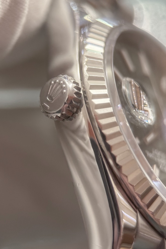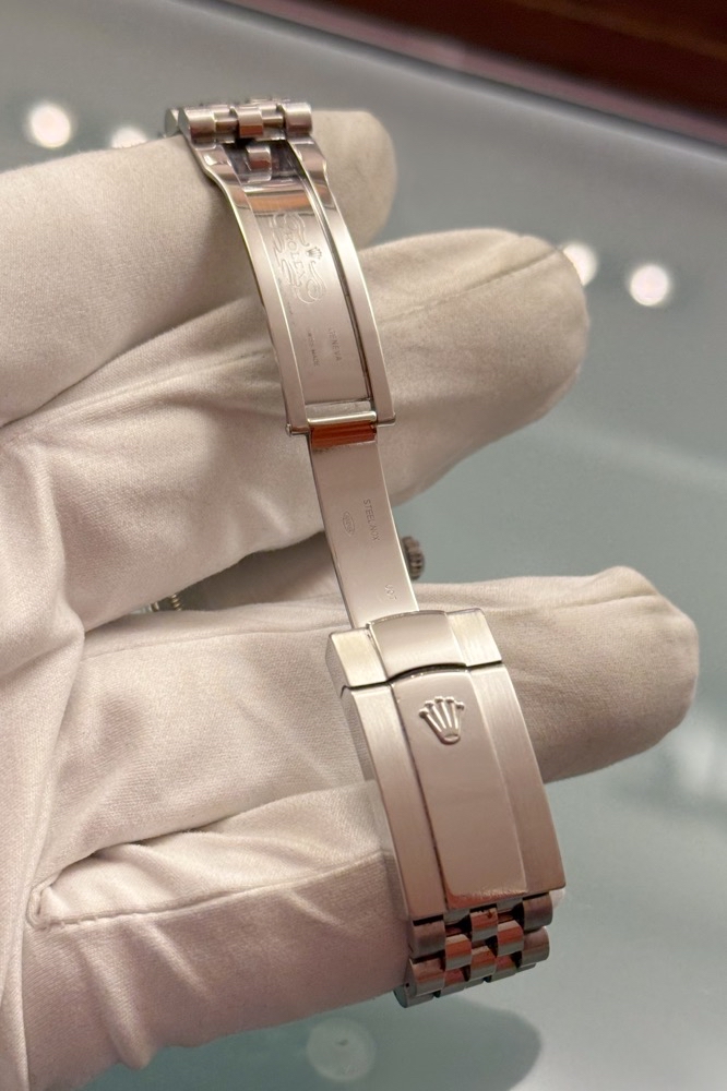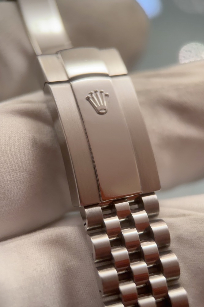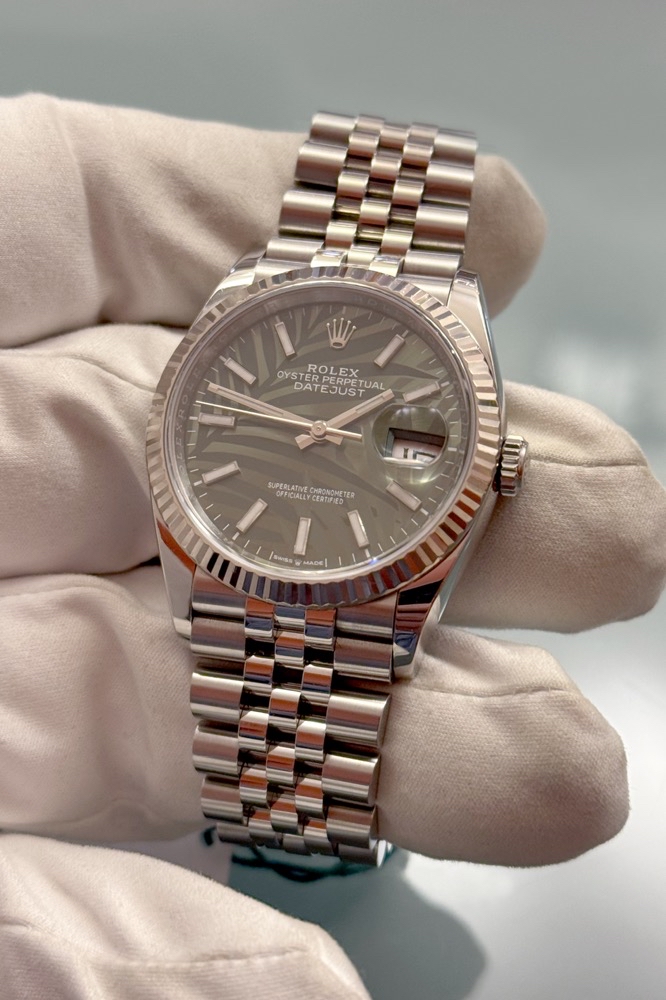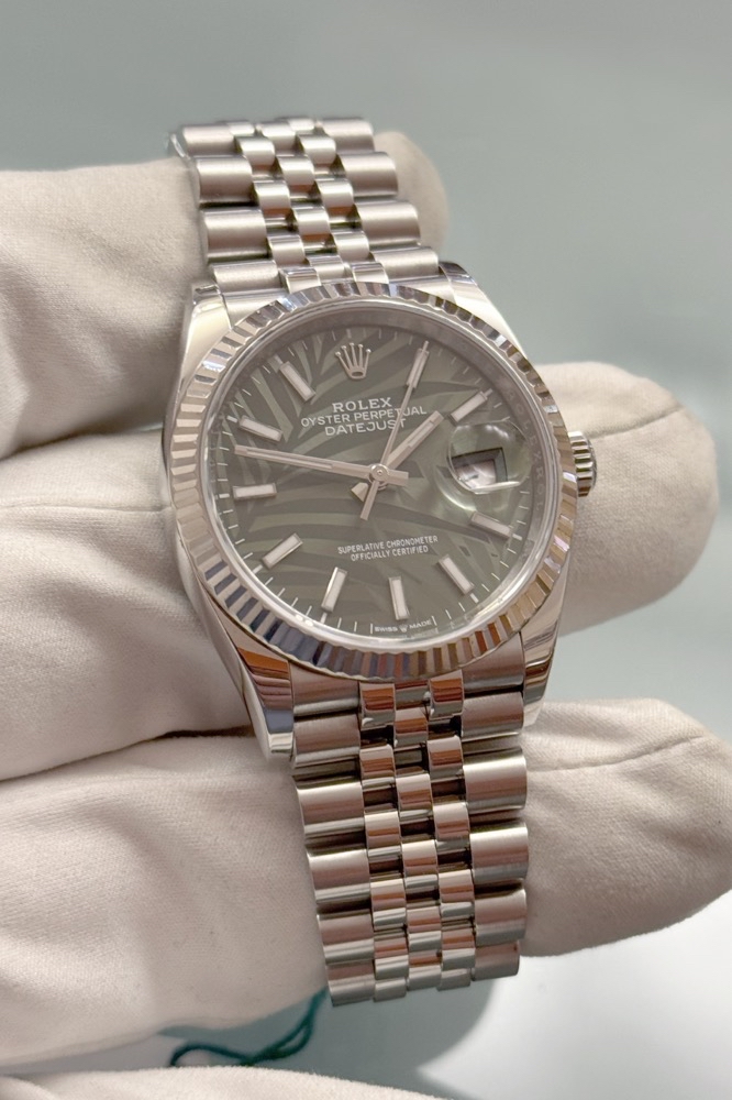Sehr gut erhaltene Rolex Datejust 36 mit grünem Palm Dial aus dem Jahr 2021.