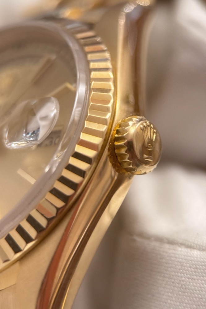 Rolex President Day-Date, Gelbgold, Champagner-Zifferblatt, Herrenuhr 18238. Offiziell zertifiziertes Chronometer-Automatikwerk mit Selbstaufzug. Oyster-Gehäuse aus 18 Karat Gelbgold, 36mm Durchmesser. Rolex-Logo auf der Krone aus 18 Karat Gelbgold. Geriffelte Lünette aus 18 Karat Gelbgold. Kratzfestes Saphirglas mit Zykloplupe. Champagnerfarbenes Zifferblatt mit erhabenen goldenen Stabindexen und gelbgoldenen Stabzeigern. Zentralsekunde. Äußere Minuten- und Halbsekunden-Einteilung. Datumsfenster bei der 3-Uhr-Öffnung. Tagesfenster bei 12 Uhr. Armband aus 18 Karat Gelbgold mit versteckter Schließe. Passt für ein 18,5cm Handgelenk. Hervorragender Zustand.