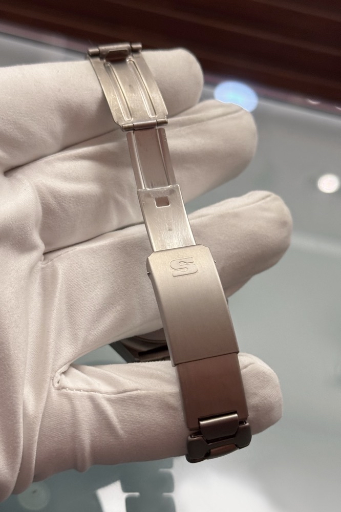 Das Gehäuse besteht aus perlgestrahltem Reintitan, was der Uhr nicht nur eine markante Optik verleiht, sondern sie auch besonders leicht und hautfreundlich macht. Mit einem Durchmesser von 40 mm und einer Höhe von 15 mm bietet die Uhr eine ausgewogene Präsenz am Handgelenk. Das mattschwarze Zifferblatt mit weißen Indizes und Leuchtzeigern sorgt für optimale Ablesbarkeit, unterstützt durch ein kratzfestes Saphirkristallglas. Die verschraubte Krone und Drücker unterstreichen die robuste Bauweise der Uhr.