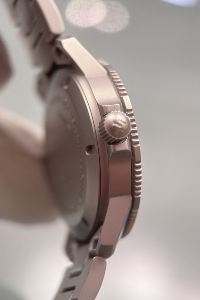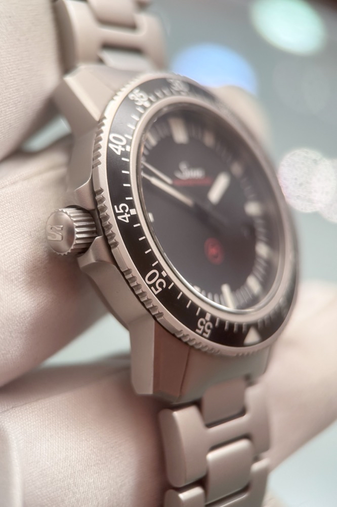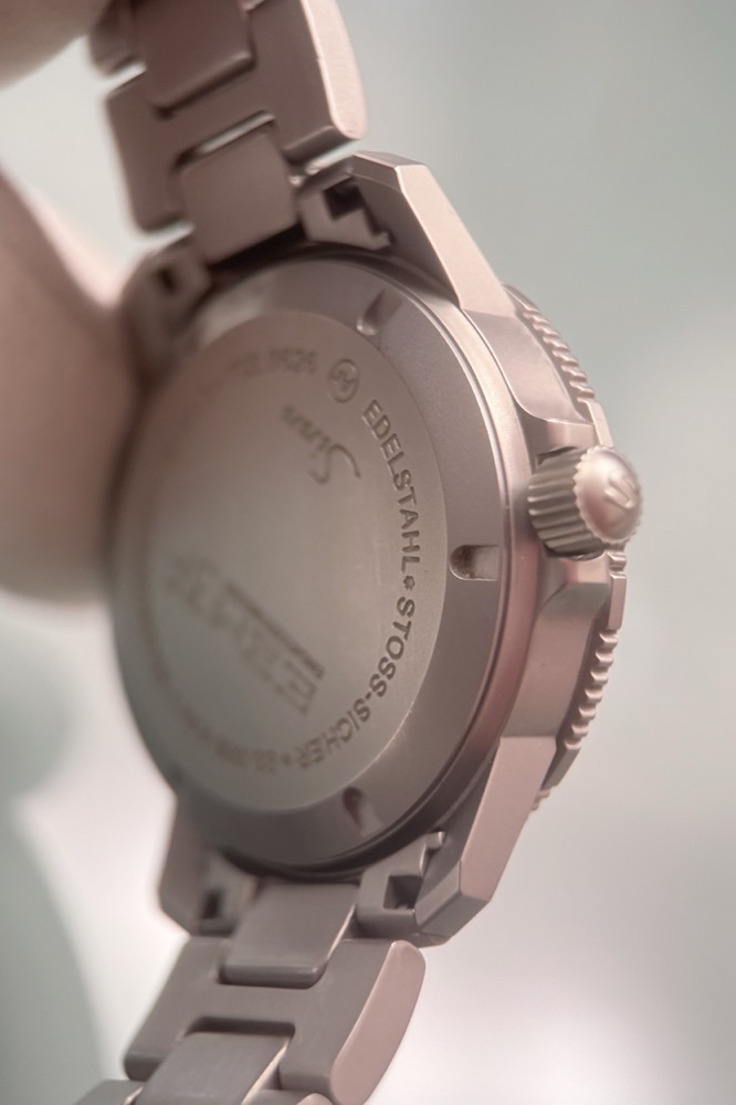 Auffallend ist weiterhin die Anordnung der Krone auf der linken Seite des perlgestrahlten Gehäuses. Diese Anordnung gewährleistet mehr Bewegungsfreiheit und verschafft der Krone eine besonders geschützte Position. Ausgestattet ist diese instrumentelle Uhr mit der Ar-Trockenhaltetechnik für eine erhöhte Funktions- und Beschlagsicherheit, einem Magnetfeldschutz bis 100mT (=80.000 A/m) und der Temperaturresistenztechnologie, die für Funktionssicherheit im Temperaturbereich von –45°C bis + 80°C sorgt.