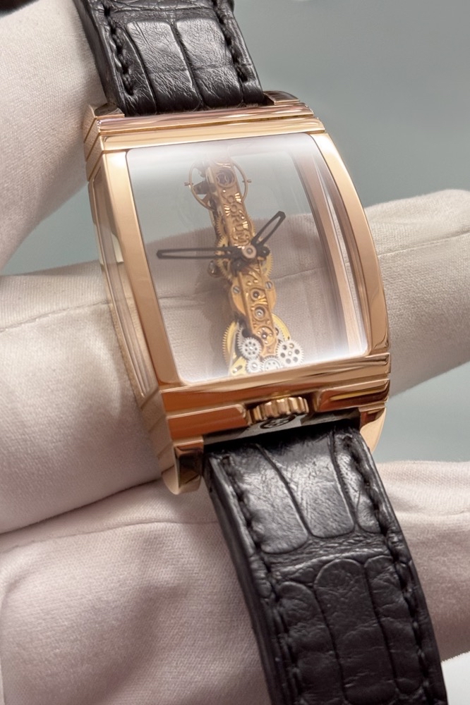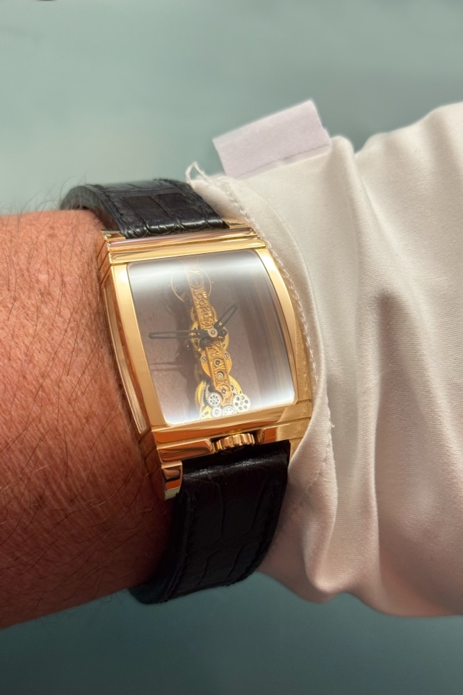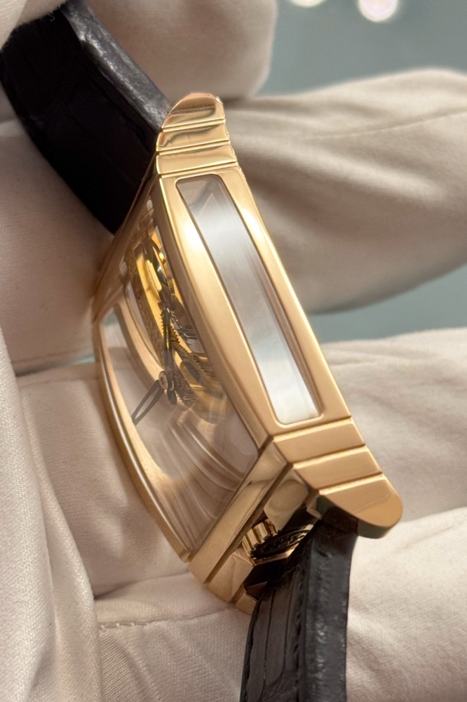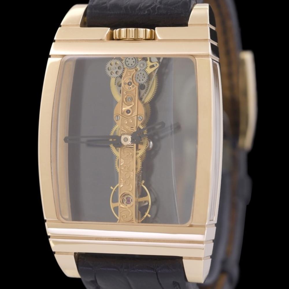 Sehr feine, 18 Karat Rotgold, Handaufzug, Curvex, vertikale Tonneau-Form, große Herrenarmbanduhr aus dem Hause Corum. Saphirglasboden mit vier Schrauben, Aufzugskrone bei 6 Uhr, sichtbares „Golden Bridge“-Uhrwerk aus 18 Karat Rotgold; seitliche Saphirglasplatten zur Sicht auf das Uhrwerk, gewölbte Saphirgläser; schwarz oxidierte Goldskelettzeiger. Mit Hauszertifilkat/Echtheitszertifikat und 12 Monaten Garantie.