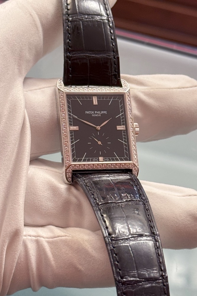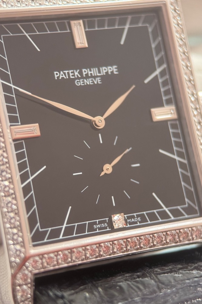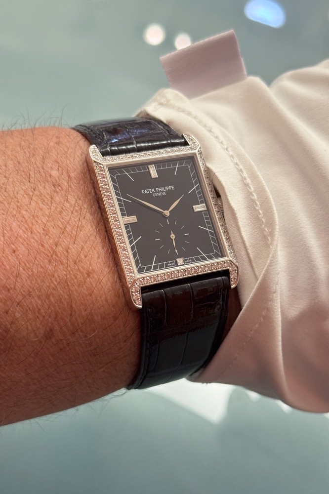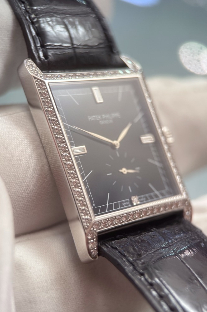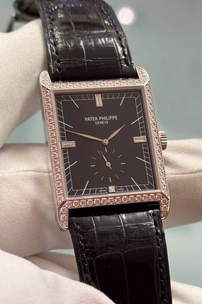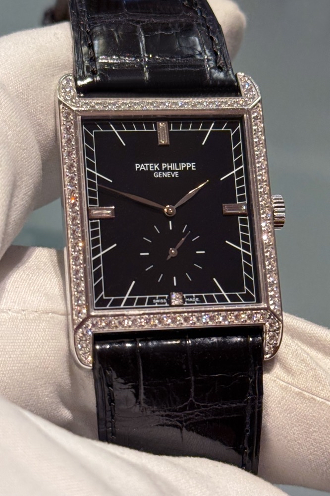 Schwarzes Glanzzifferblatt mit weißgoldenen Stabindizes, Baguette-Diamanten bei 3,9 und 12 Uhr, Brillant bei 6 Uhr, Kleine Sekunde und Saphirglas. PATEK PHILIPPE Handaufzugswerk Kaliber 215PS.