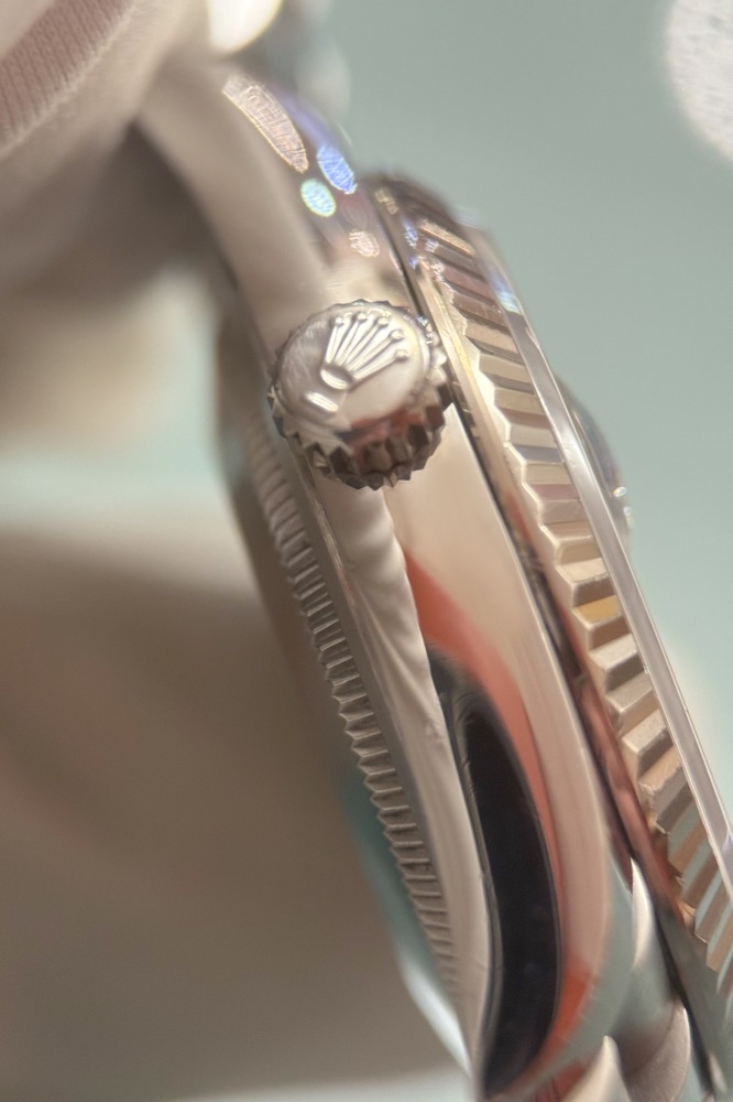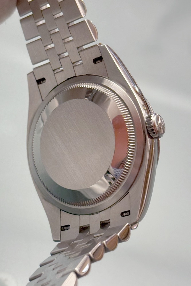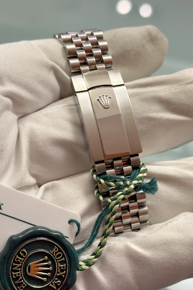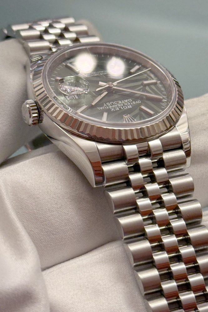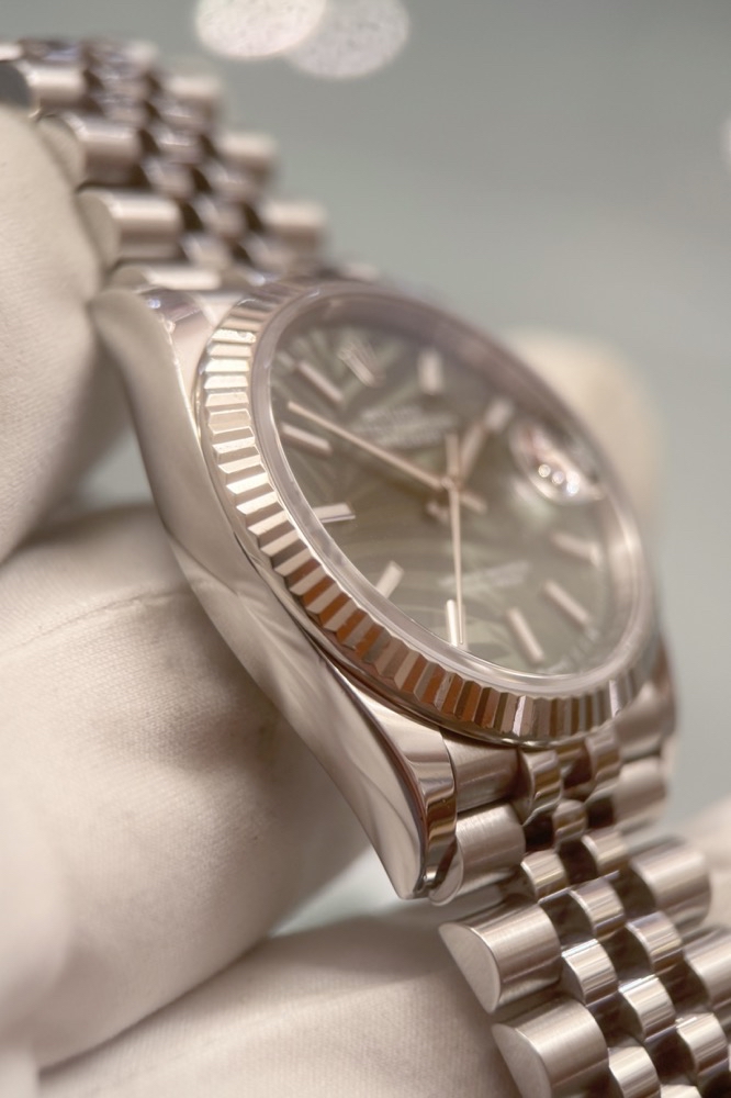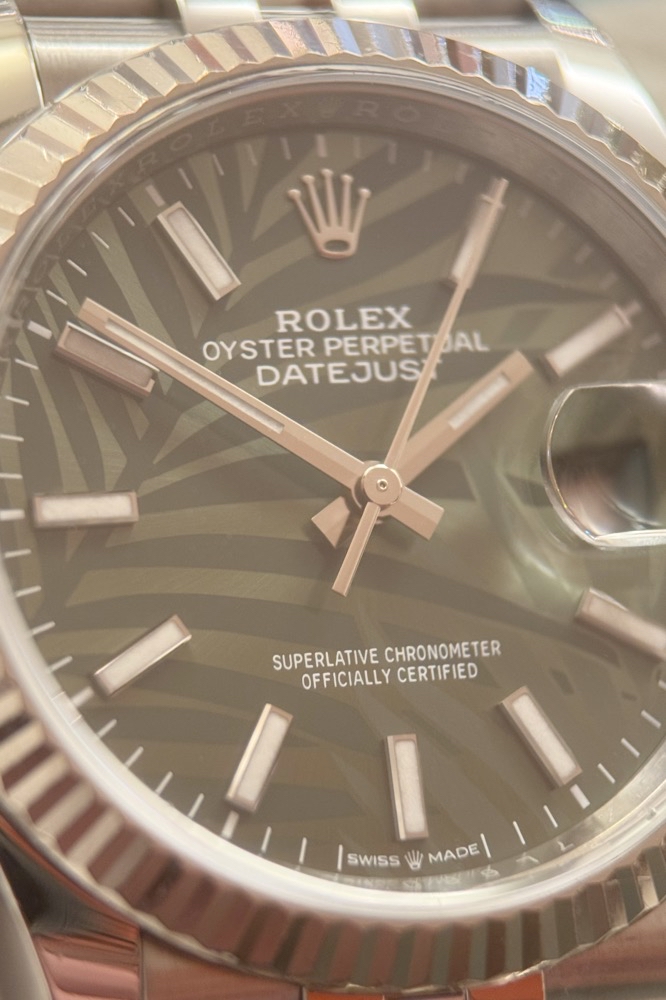 Sehr gut erhaltene Rolex Datejust 36 mit grünem Palm Dial aus dem Jahr 2021.