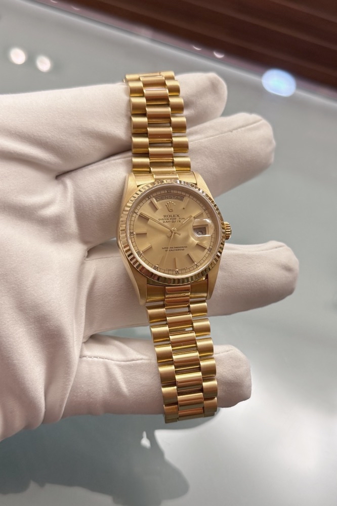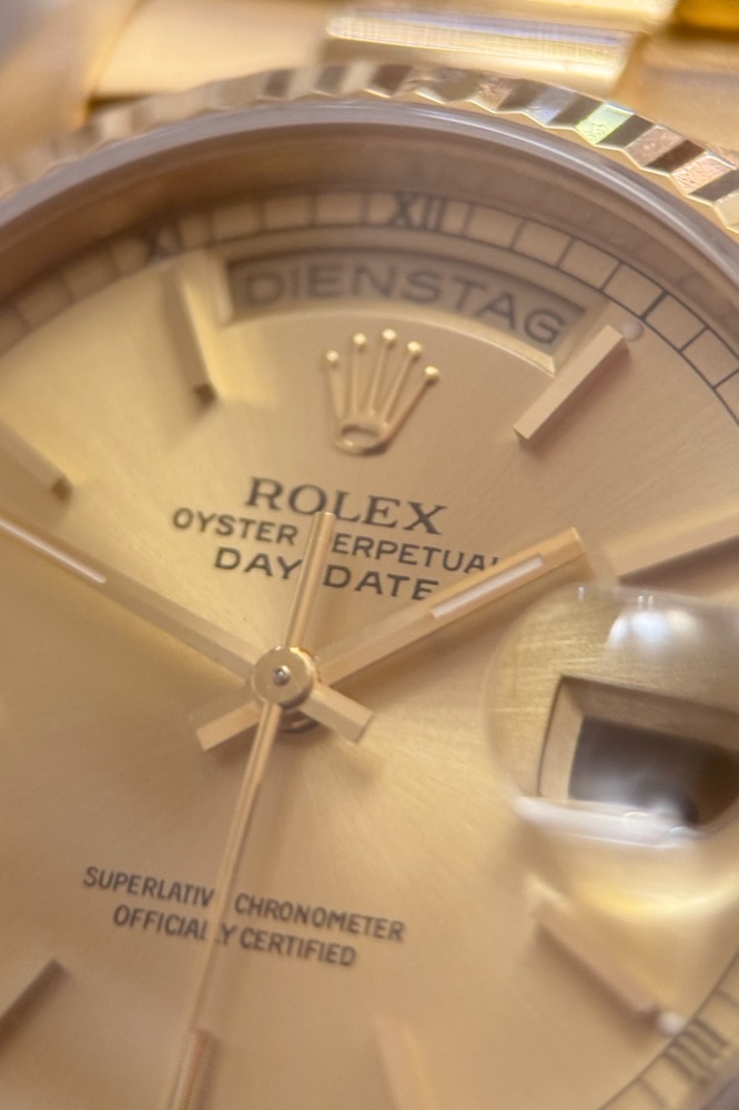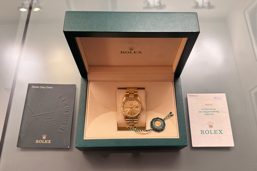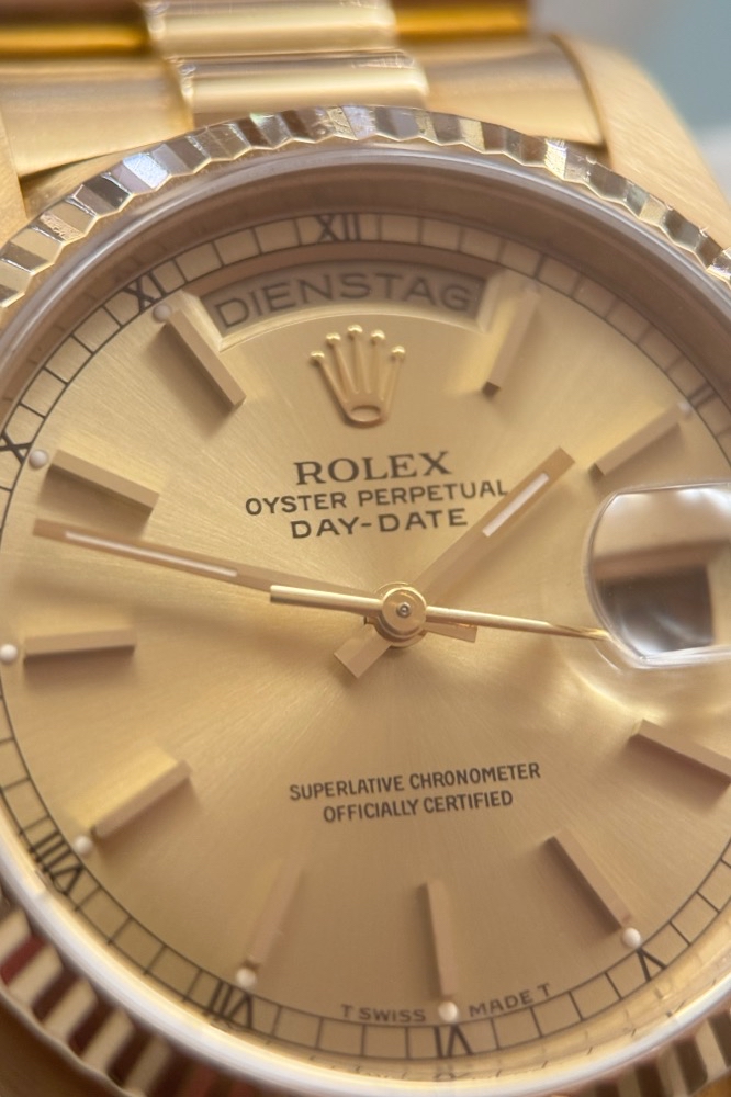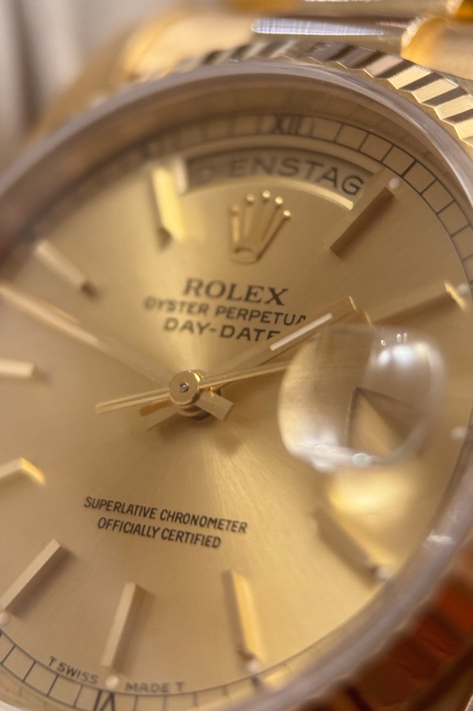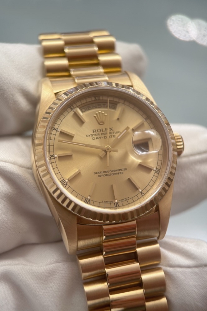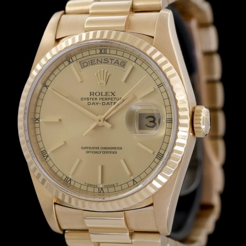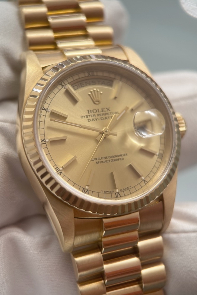 Rolex President Day-Date, Gelbgold, Champagner-Zifferblatt, Herrenuhr 18238. Offiziell zertifiziertes Chronometer-Automatikwerk mit Selbstaufzug. Oyster-Gehäuse aus 18 Karat Gelbgold, 36mm Durchmesser. Rolex-Logo auf der Krone aus 18 Karat Gelbgold. Geriffelte Lünette aus 18 Karat Gelbgold. Kratzfestes Saphirglas mit Zykloplupe. Champagnerfarbenes Zifferblatt mit erhabenen goldenen Stabindexen und gelbgoldenen Stabzeigern. Zentralsekunde. Äußere Minuten- und Halbsekunden-Einteilung. Datumsfenster bei der 3-Uhr-Öffnung. Tagesfenster bei 12 Uhr. Armband aus 18 Karat Gelbgold mit versteckter Schließe. Passt für ein 18,5cm Handgelenk. Hervorragender Zustand.