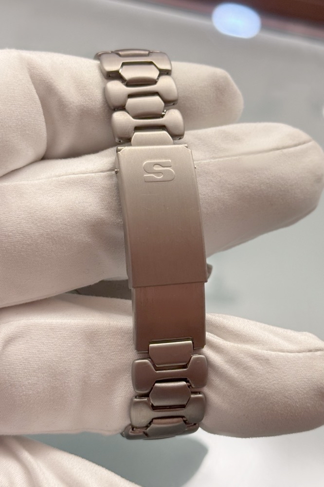Das Gehäuse besteht aus perlgestrahltem Reintitan, was der Uhr nicht nur eine markante Optik verleiht, sondern sie auch besonders leicht und hautfreundlich macht. Mit einem Durchmesser von 40 mm und einer Höhe von 15 mm bietet die Uhr eine ausgewogene Präsenz am Handgelenk. Das mattschwarze Zifferblatt mit weißen Indizes und Leuchtzeigern sorgt für optimale Ablesbarkeit, unterstützt durch ein kratzfestes Saphirkristallglas. Die verschraubte Krone und Drücker unterstreichen die robuste Bauweise der Uhr.